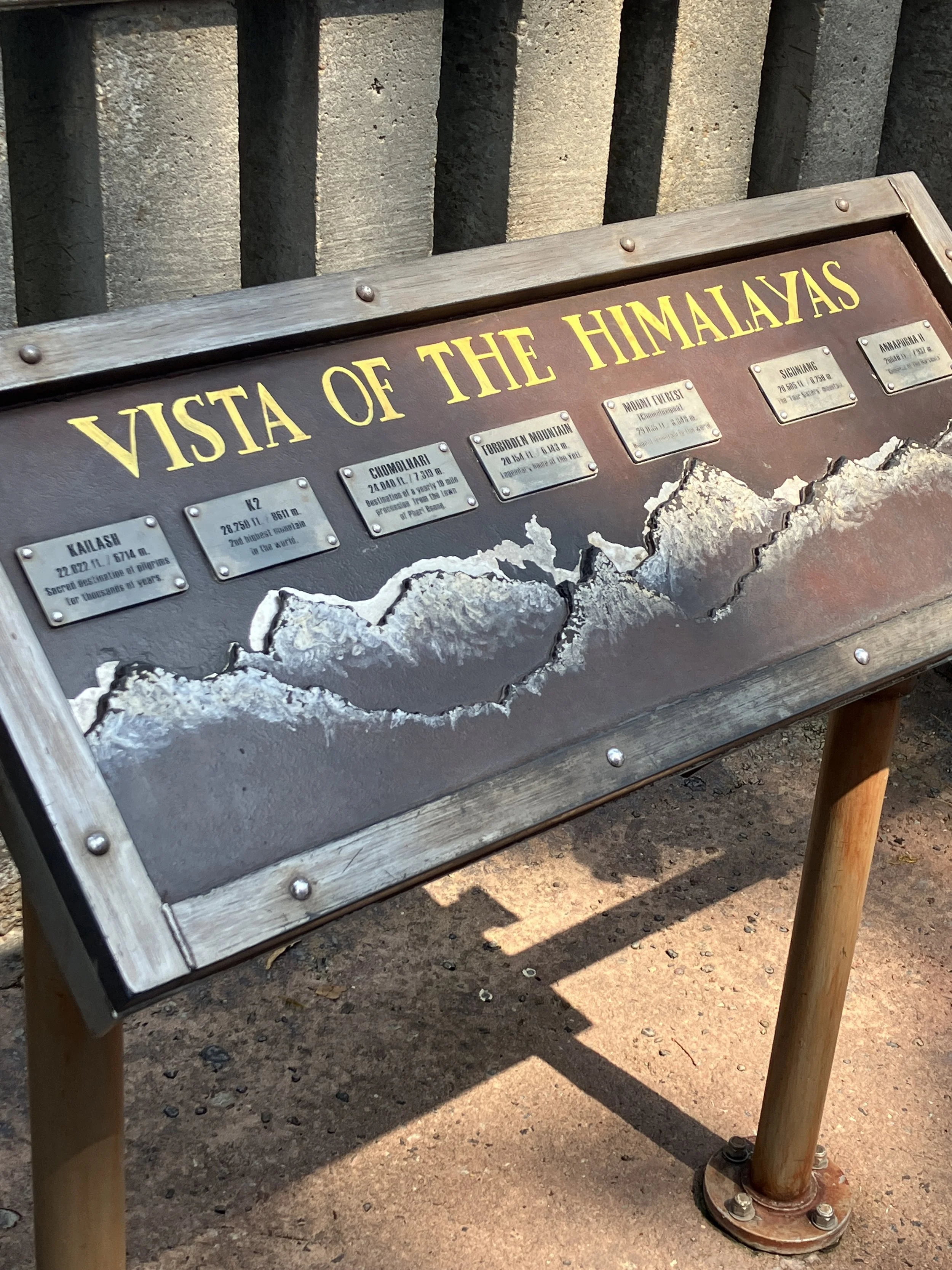 Next to the model is a rustic sign that names several major Himalayan peaks, including: