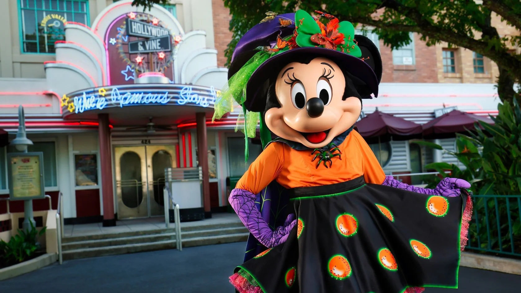 Hollywood Studios brings a touch of old school Halloween glamour. Think vintage decor, classic character designs, and subtle fall details that give the park a slightly spooky edge, perfect for the golden age Hollywood vibe. The real highlight here is the character costumes; you may spot Minnie, Mickey, and friends dressed in festive Halloween looks at special dining experiences like Minnie’s Halloween Dine at Hollywood & Vine. This seasonal character dining experience is one of the most festive ways to celebrate fall at Walt Disney World. During Minnie’s Halloween and Dine, guests enjoy a buffet filled with comforting, family friendly favorites (and often a few seasonal dishes), but the real star of the show is the character fun. Minnie, Mickey, Goofy, and Pluto make their way around the restaurant dressed in their Halloween costumes. Think Minnie in a sparkling witch costume, Mickey as a dapper vampire, and other playful looks that make for perfect photo ops. The atmosphere is lively and colorful, with themed decor that matches the season and music that keeps the spooky but not scary energy going. It’s a great choice for families, since kids get to meet their favorite characters without the party crowds.