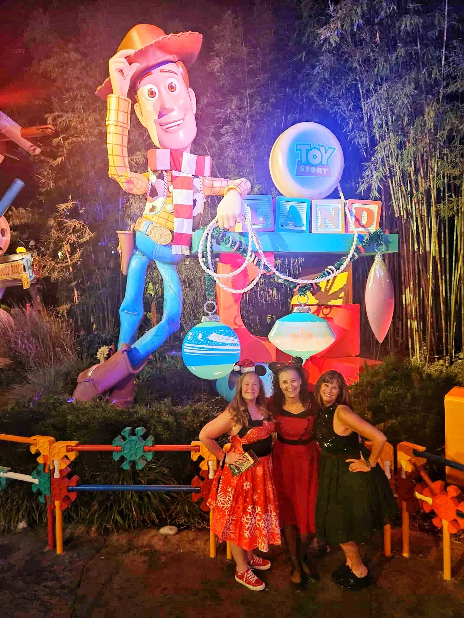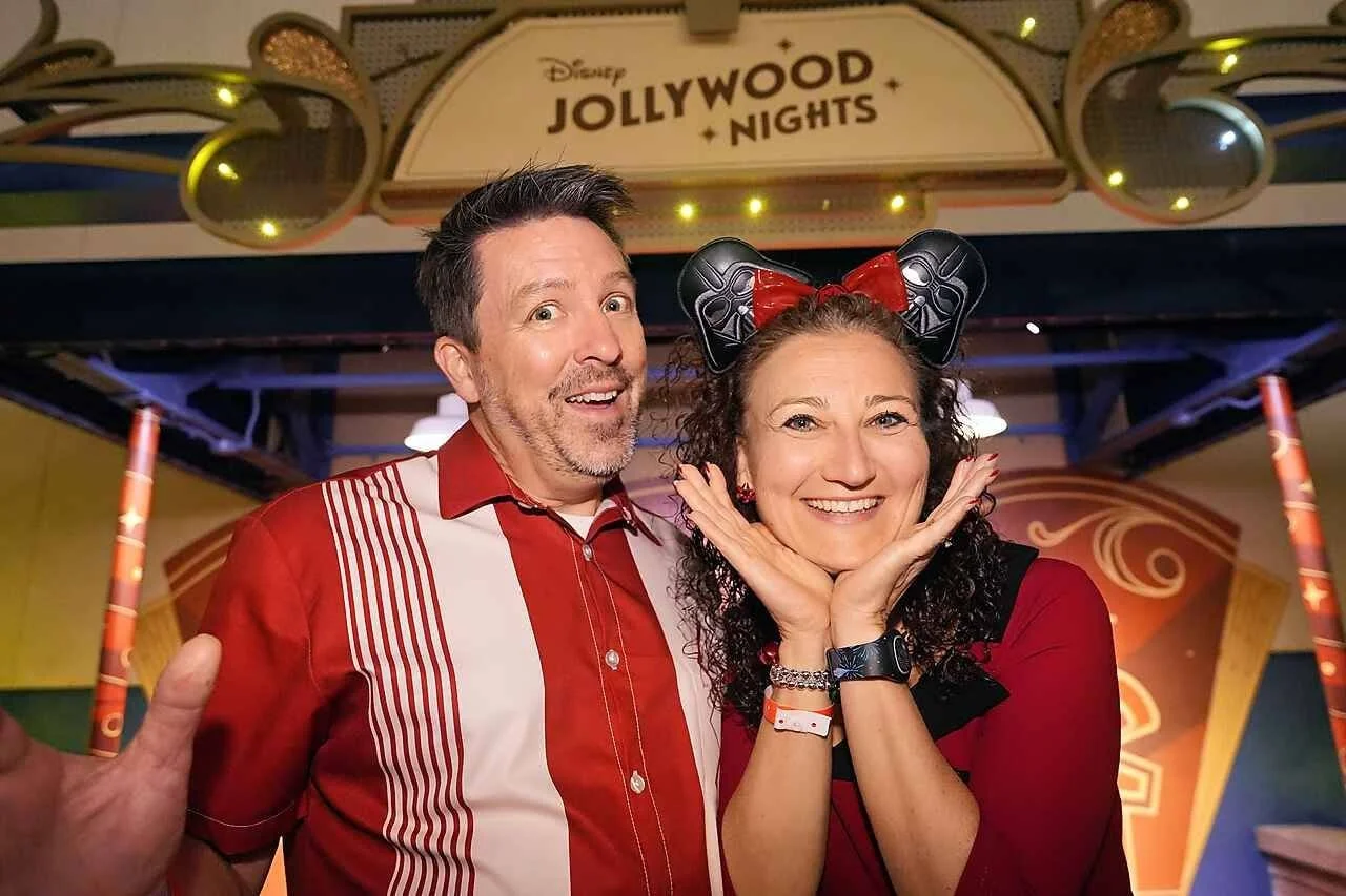 There’s a certain kind of holiday magic that only Walt Disney World can deliver, and this year’s Jollywood Nights at Hollywood Studios wrapped it all in a vintage bow of Hollywood glamour. Our party night happened to be completely sold out, adding an extra buzz of excitement as my husband Jason and I stepped into this dreamy, retro tinsel-town celebration alongside our Disney Nerd partners in crime: Bradley, Misty, and Amanda. We arrived dressed in our very best Old Hollywood glam, ready to sparkle under the twinkling lights, and it truly felt like we’d slipped straight into a Christmas classic.