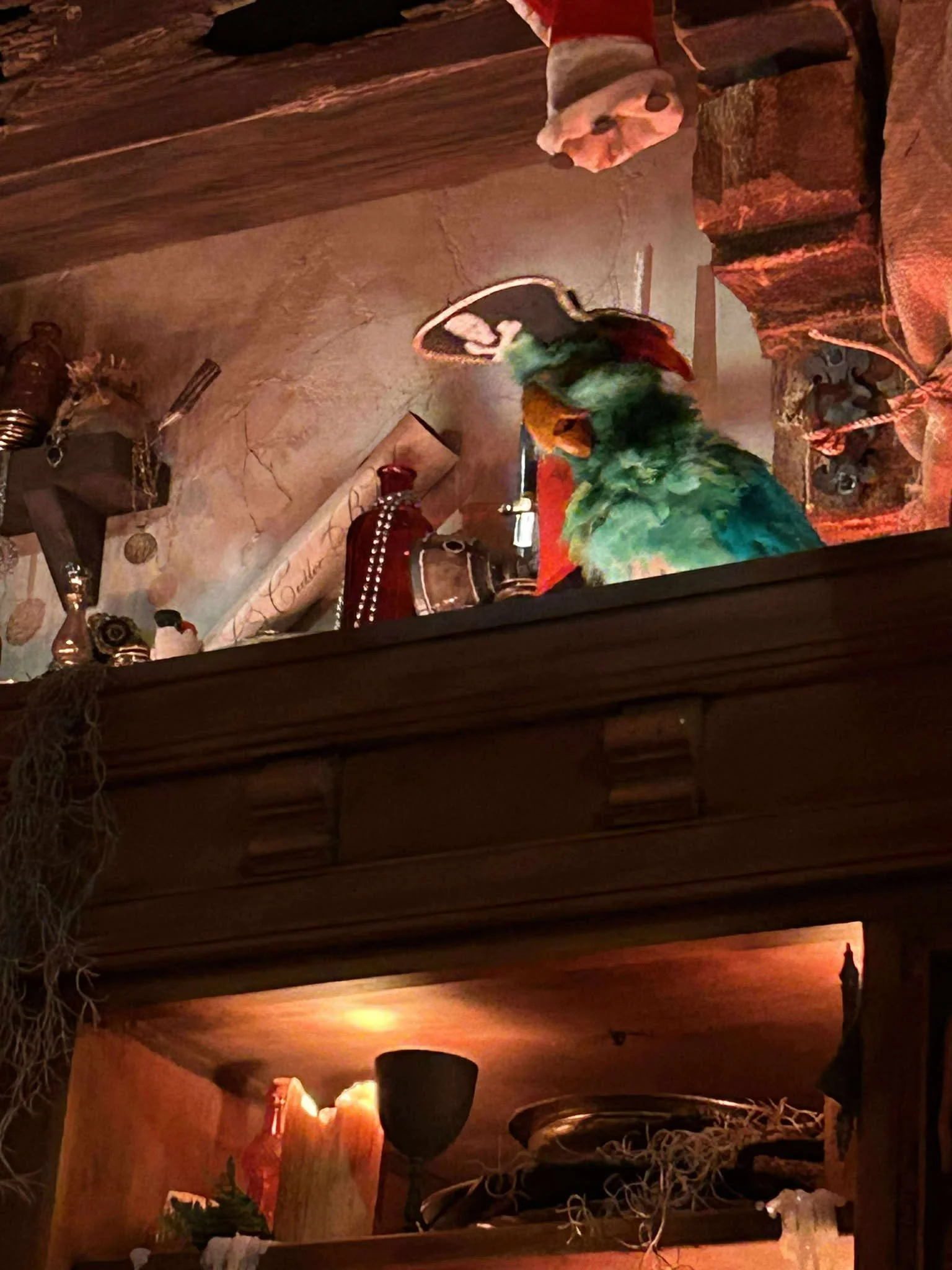 The star of the show, however, is on a perch above the bar: Rummy, the chatty parrot quartermaster! During our visit, a simulated "storm" rolled through the tavern, with the pirate bartenders yelling orders to batten down the hatches. Rummy squawked his commands, the lights flashed, and it was a burst of pure, chaotic pirate fun!
